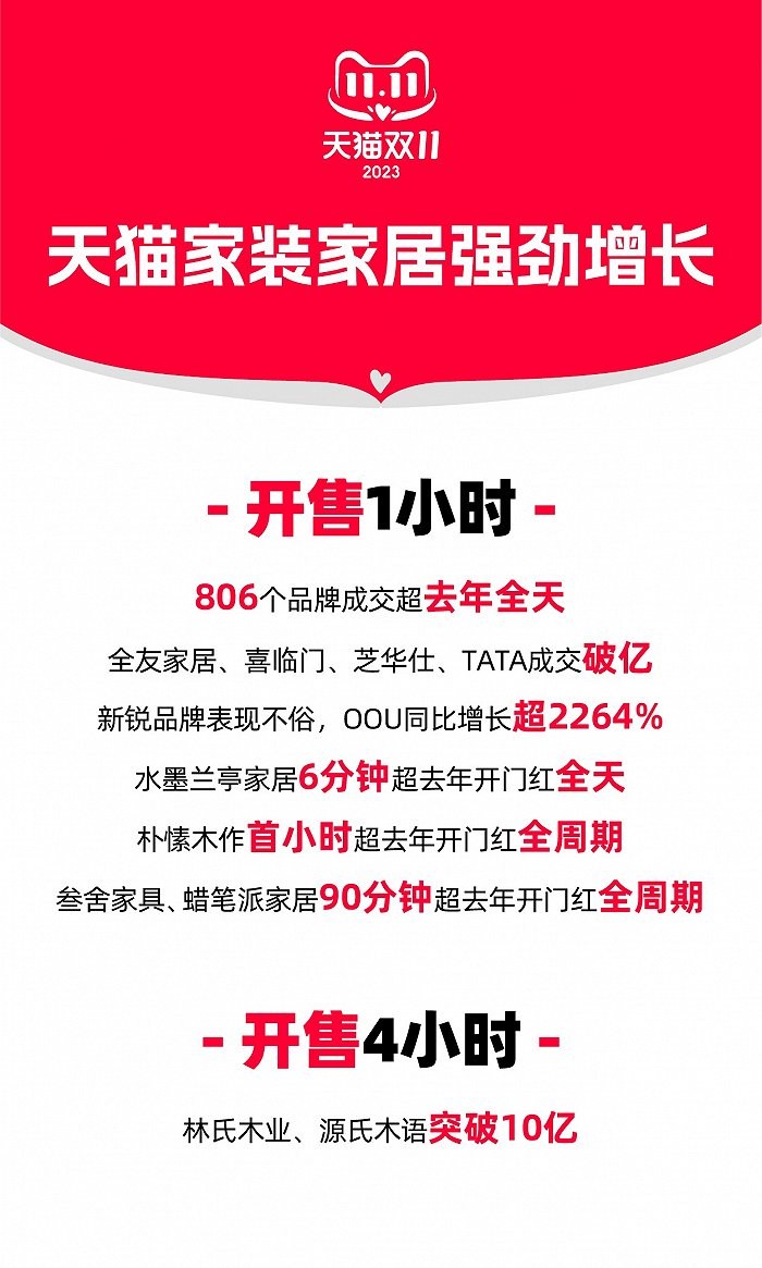 10月31日晚8點,天貓雙11正式開賣,家裝家居品牌爆發式增長。首小時,806個品牌成交超去年全天;開售4小時,林氏木業及源氏木語成交額突破10億元。